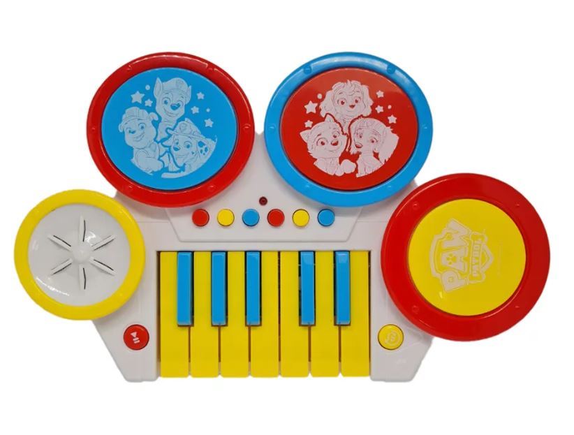 A Bateria Com piano Patrulha Canina é um instrumento musical de brinquedo com teclas de piano e sons de bateria para criar ritmos e melodias, além de músicas divertidas. Vem com imagens da Patrulha Canina nos tambores. Dois modos de brincar: Ritmo e Melodias. Com botão play e pause para começar e pausar a música e botão mixer, para dar som de Dj as criações. Utiliza 3 pilhas AA, 1,5v, alcalinas.