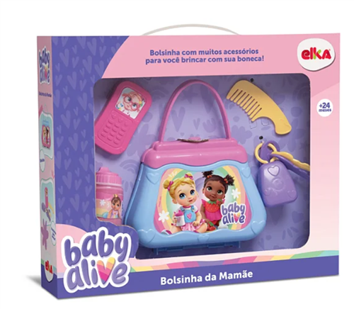 Na Bolsa da Mamãe Baby Alive tem tudo: celular, pente, mamadeira de suco e a chave do carro. Não é o máximo? Agora é só sair para passear levando sua bolsinha, igual a mamãe. Brincadeiras de faz de conta ajuda a criança a desenvolver habilidades como a criatividade, empatia e competências sociais. Conteúdo: 1 bolsa, 1 celular, 1 chaveiro, 1 mamadeira de suco , 1 pente.