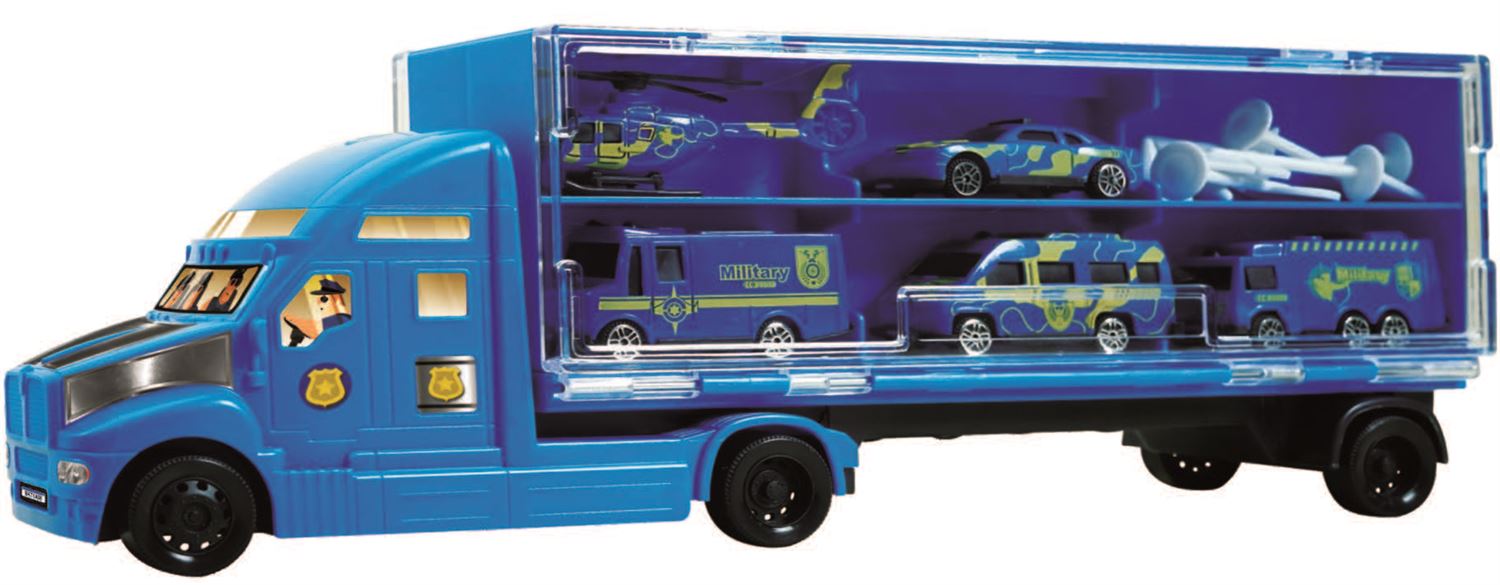 Carreta policial, com alça para carregar podendo ser usada como maleta para guardar até 12 carrinhos.