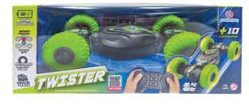 Carro de controle remoto de manobras. Pneus coloridos, macios em borracha para todo terreno. 10 comandos, bateria recarregável. Condução em 2 tipos de posição, MODO TRUCK, no qual a carenagem fica mais elevada do solo, melhor para terrenos acidentados e fica com mais característica off-road. E MODO SPY, em que a carenagem fica mais próxima ao solo, dando melhor controle e estabilidade para manobras em velocidade, ficando com característica mais esportiva. Ainda na função SPY, mesmo quando capota, o Twister continua andando normalmente de ponta cabeça. Tem 29 cm quando no modo SPY.