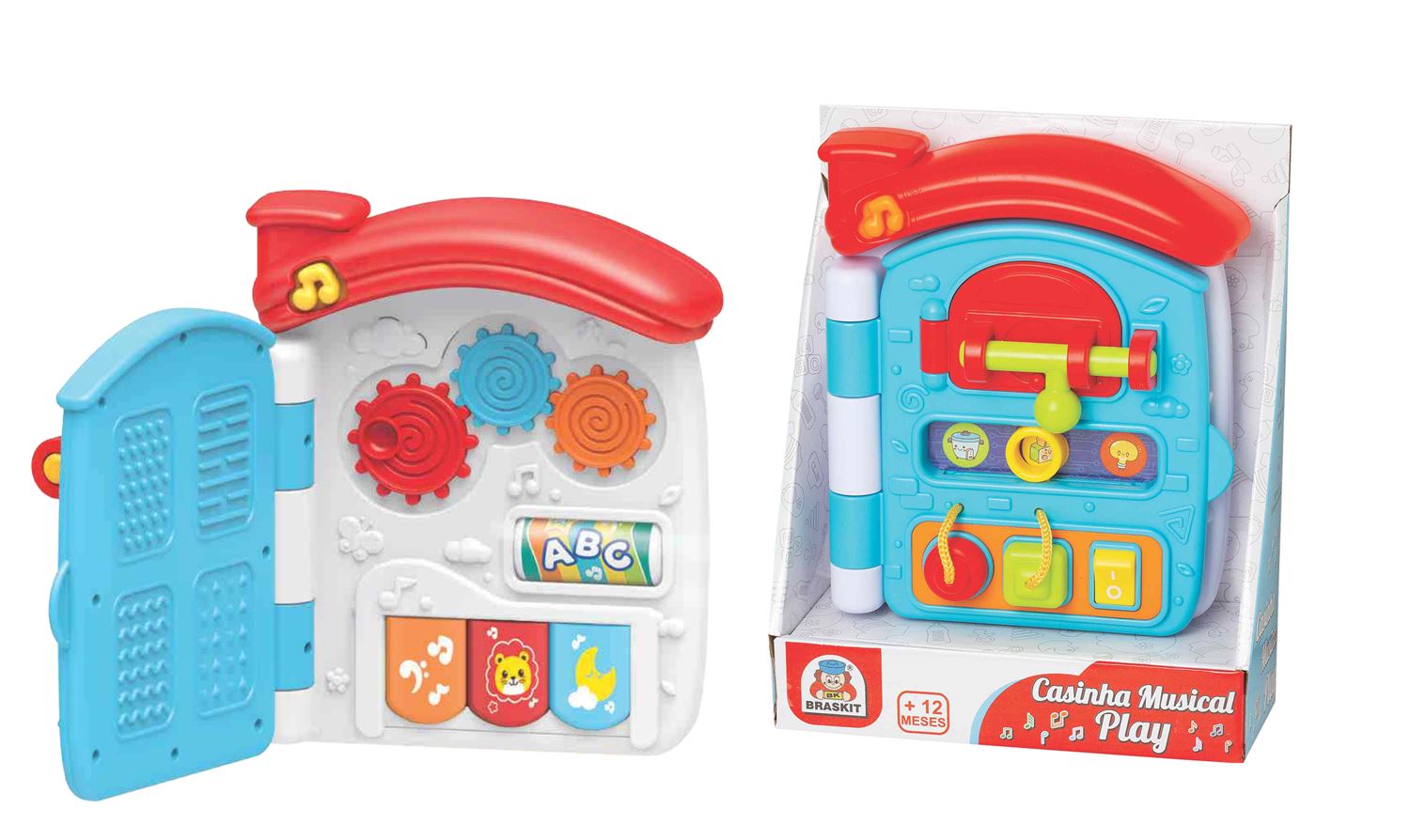 Casinha musical com diversas atividades, possui luzes piscantes, toca músicas e sons de animais.