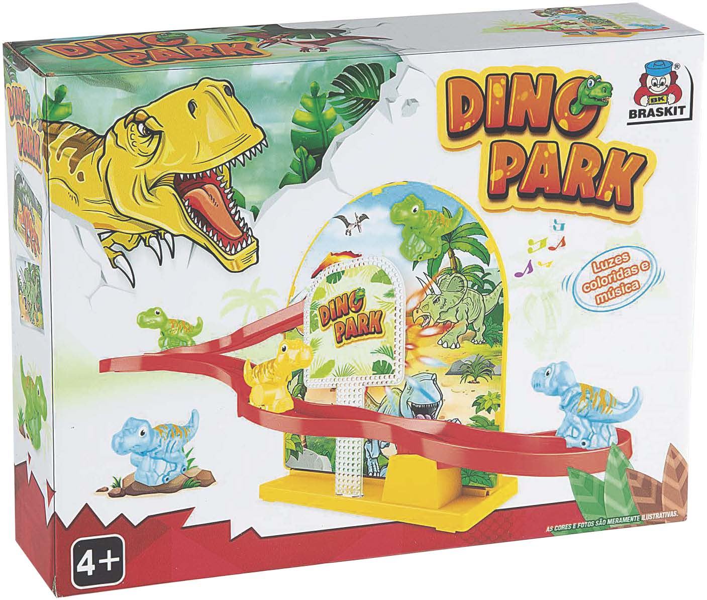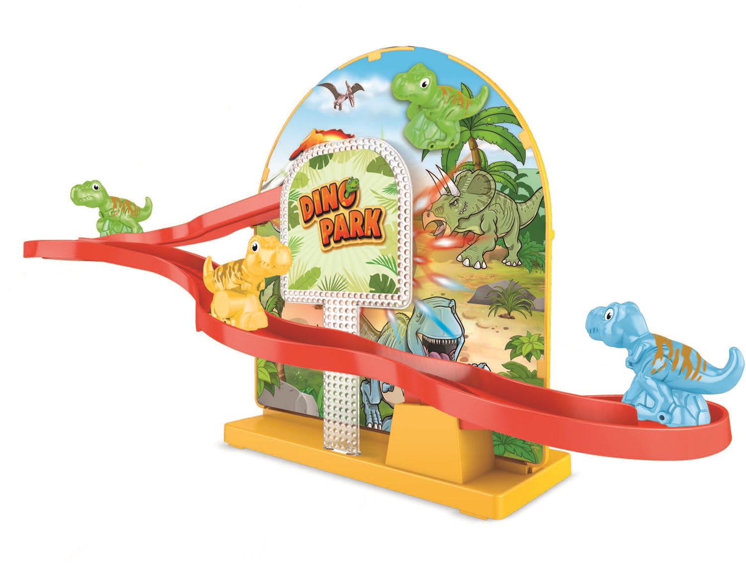 Os dinossauros sobem na base através de um imãe deslizam pelas rampas. Emite som e acende luzes.