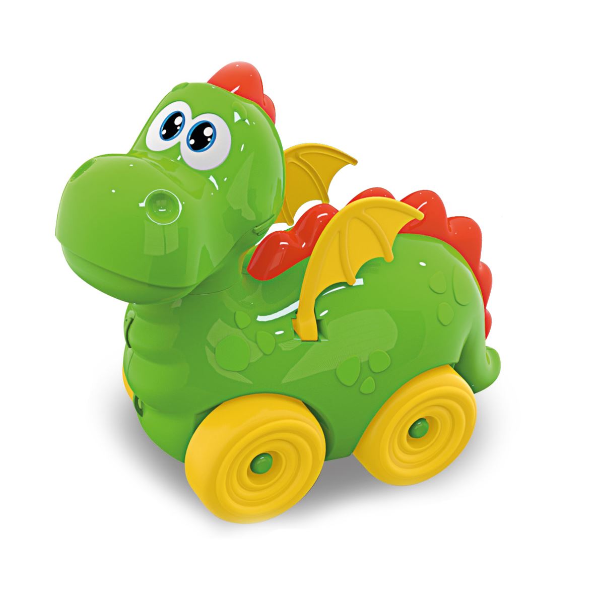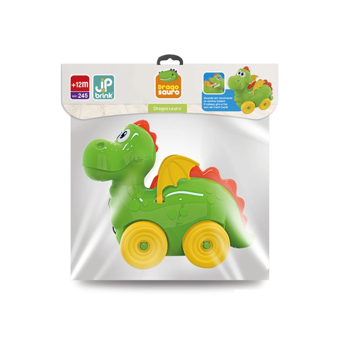 Dragossauro Baby é um carrinho que possui formato de dinossauro com asas de dragão e é interativo! Quando as rodinhas giram, suas asas também mexem! Além disso, sua cabeça gira e emite som de crec crec! Embalagem em solapa.