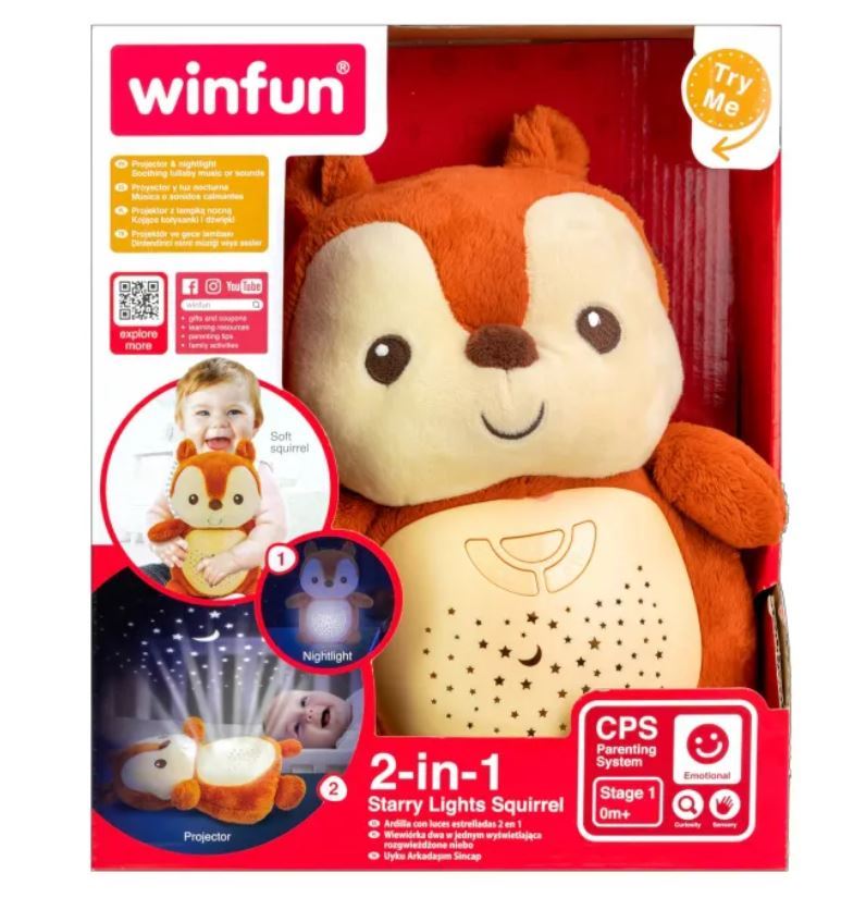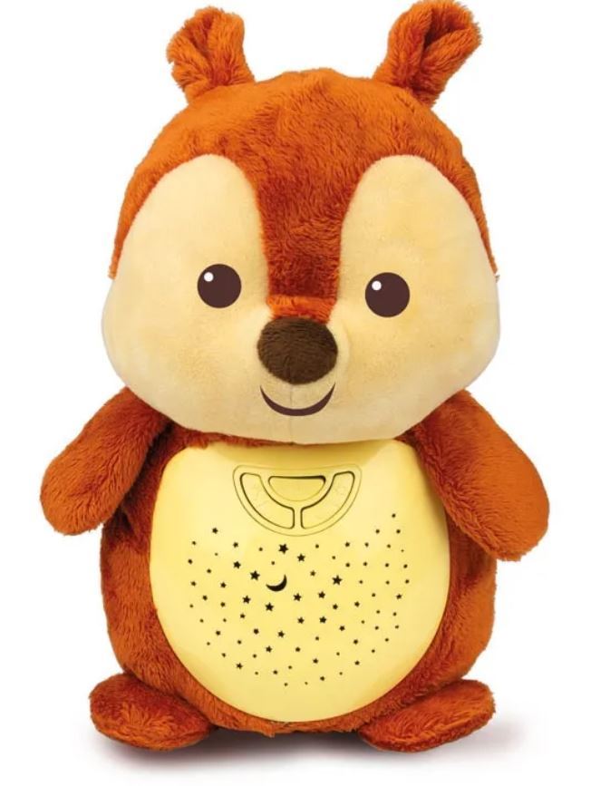 O Esquilo Dorme Comigo é uma pelúcia hipoalergênica, com função 2 em 1: Projetor noturno e luminária. Projeta um céu estrelado de brilho suave em cores diferentes. Reproduz sons da natureza e canções de ninar. Estimula a memória afetiva, desperta a curiosidade e promove o desenvolvimento sensorial do bebê de forma lúdica e envolvente. Utiliza 3 pilhas AA, 1,5v, alcalinas.