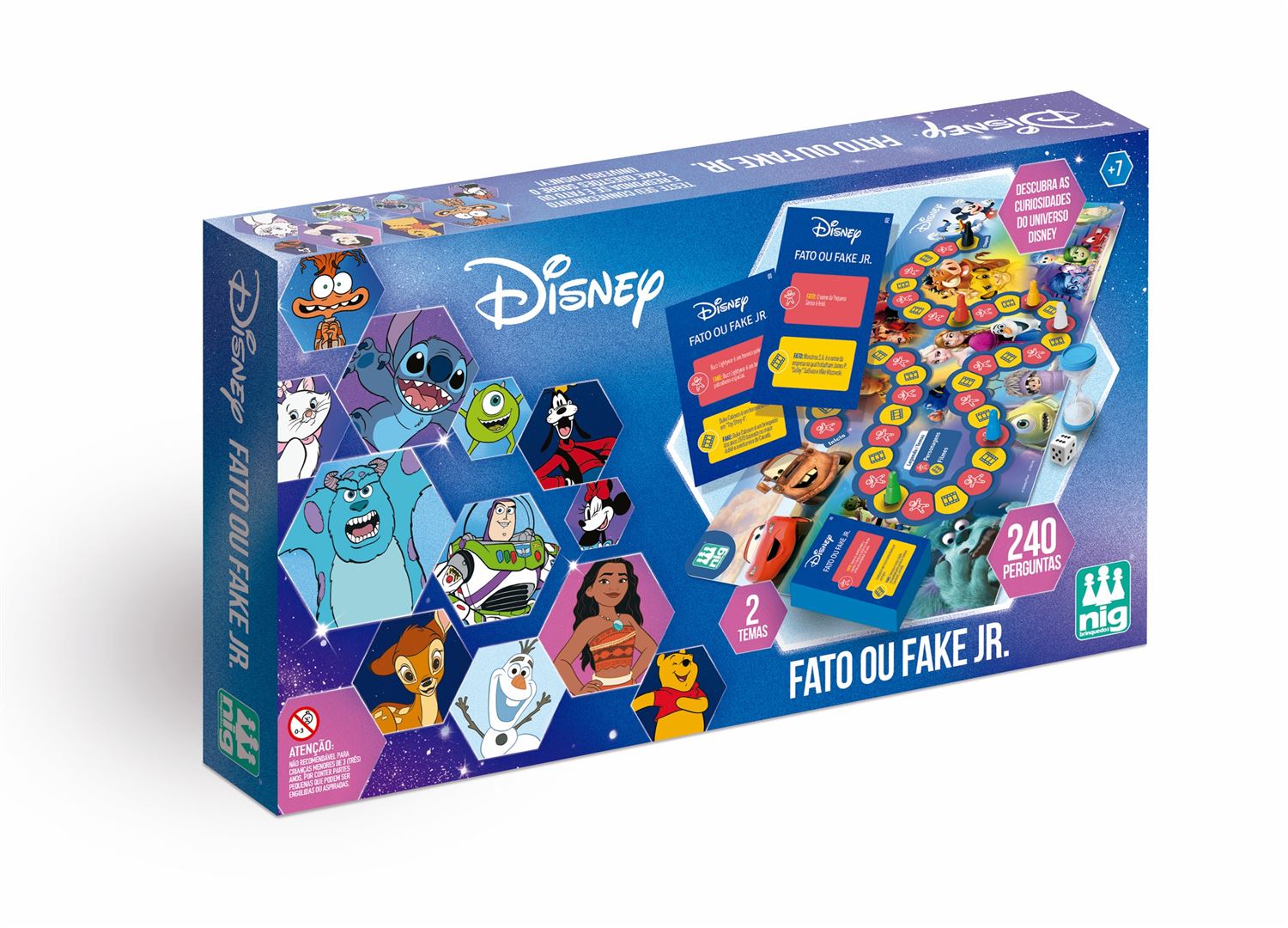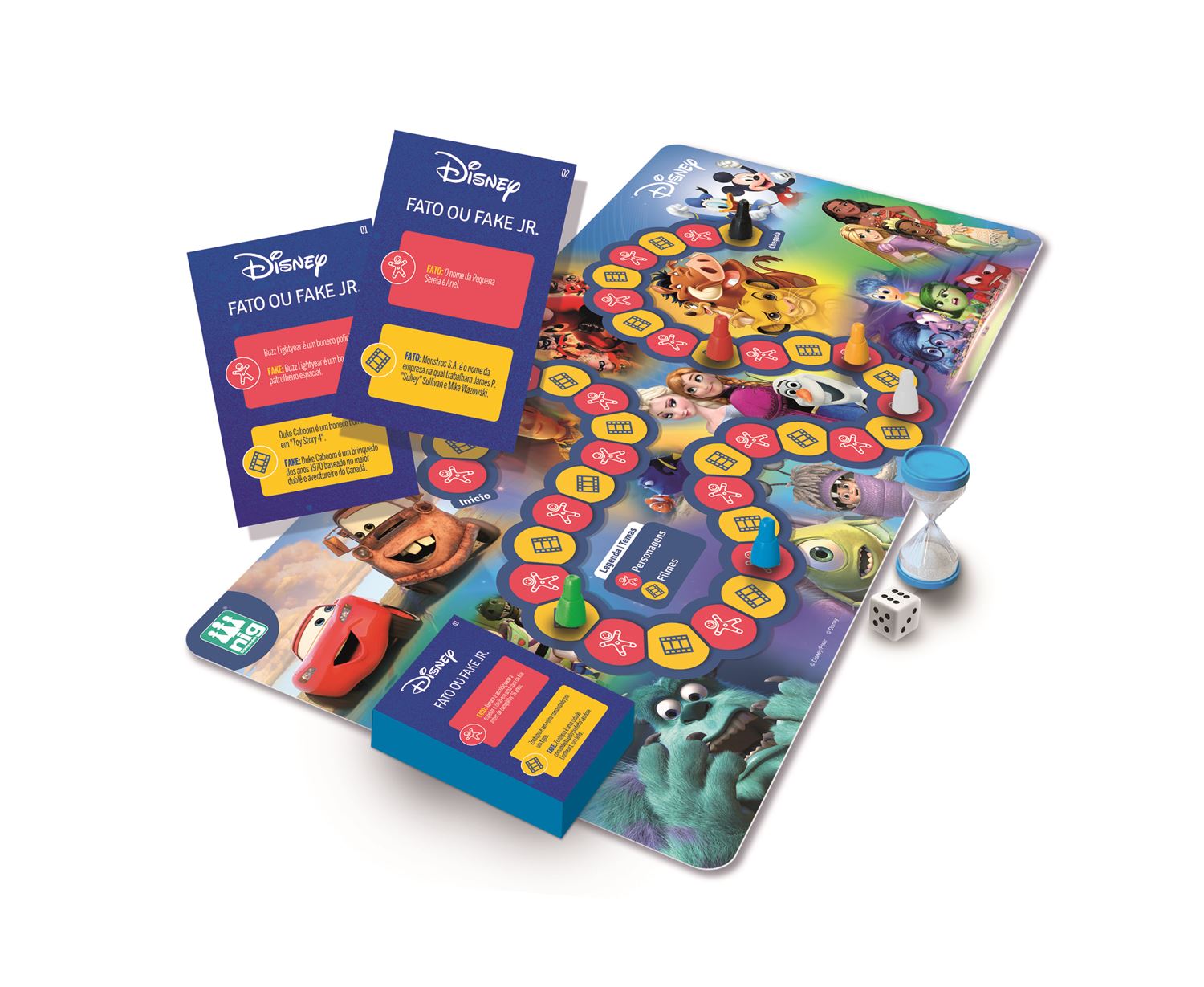 Desafio para os fãs do universo Disney! São 120 cartas com questões sobre dois temas: personagens e filmes. O tempo será contato na ampulheta. O jogador que completar seu tabuleiro em primeiro lugar é o vencedor.