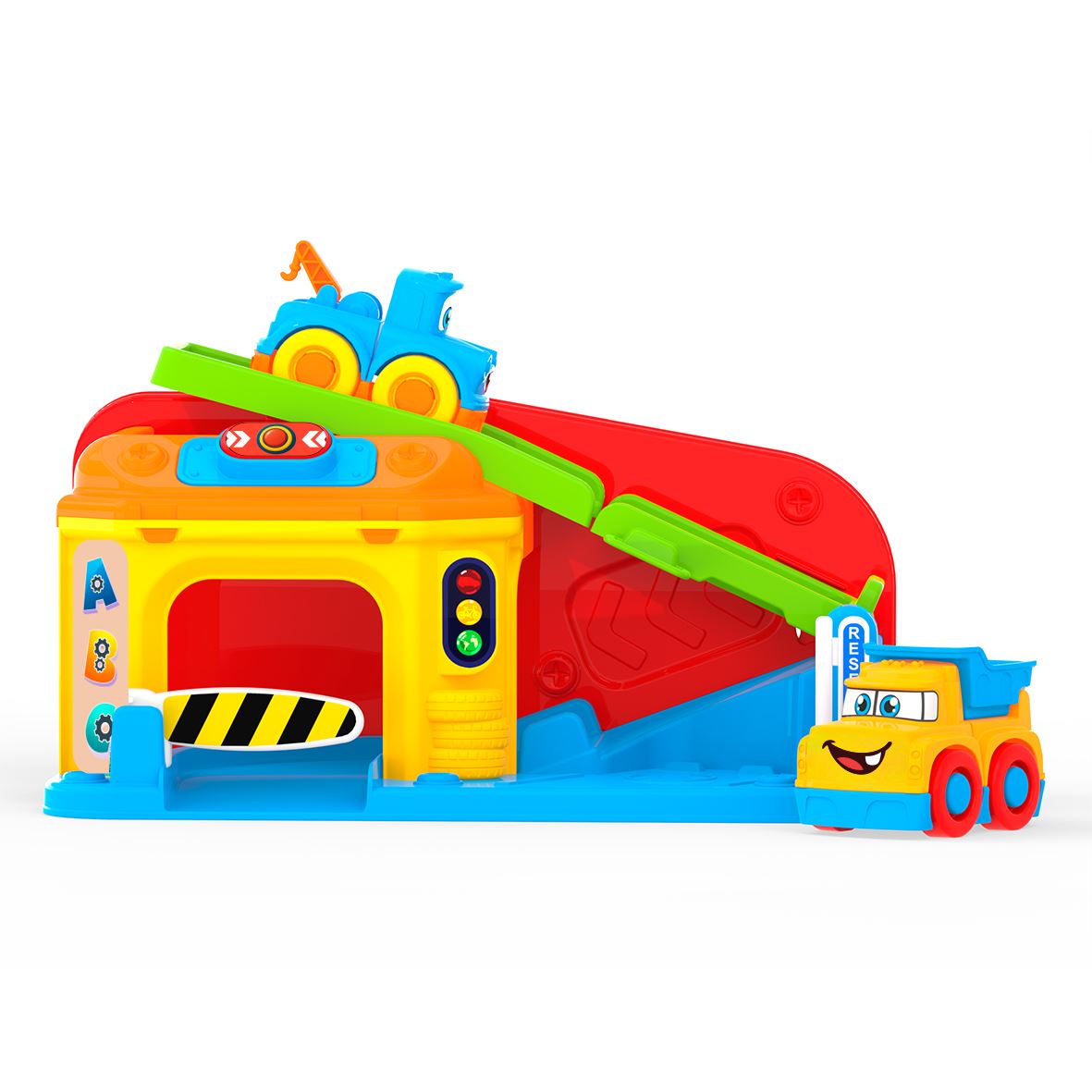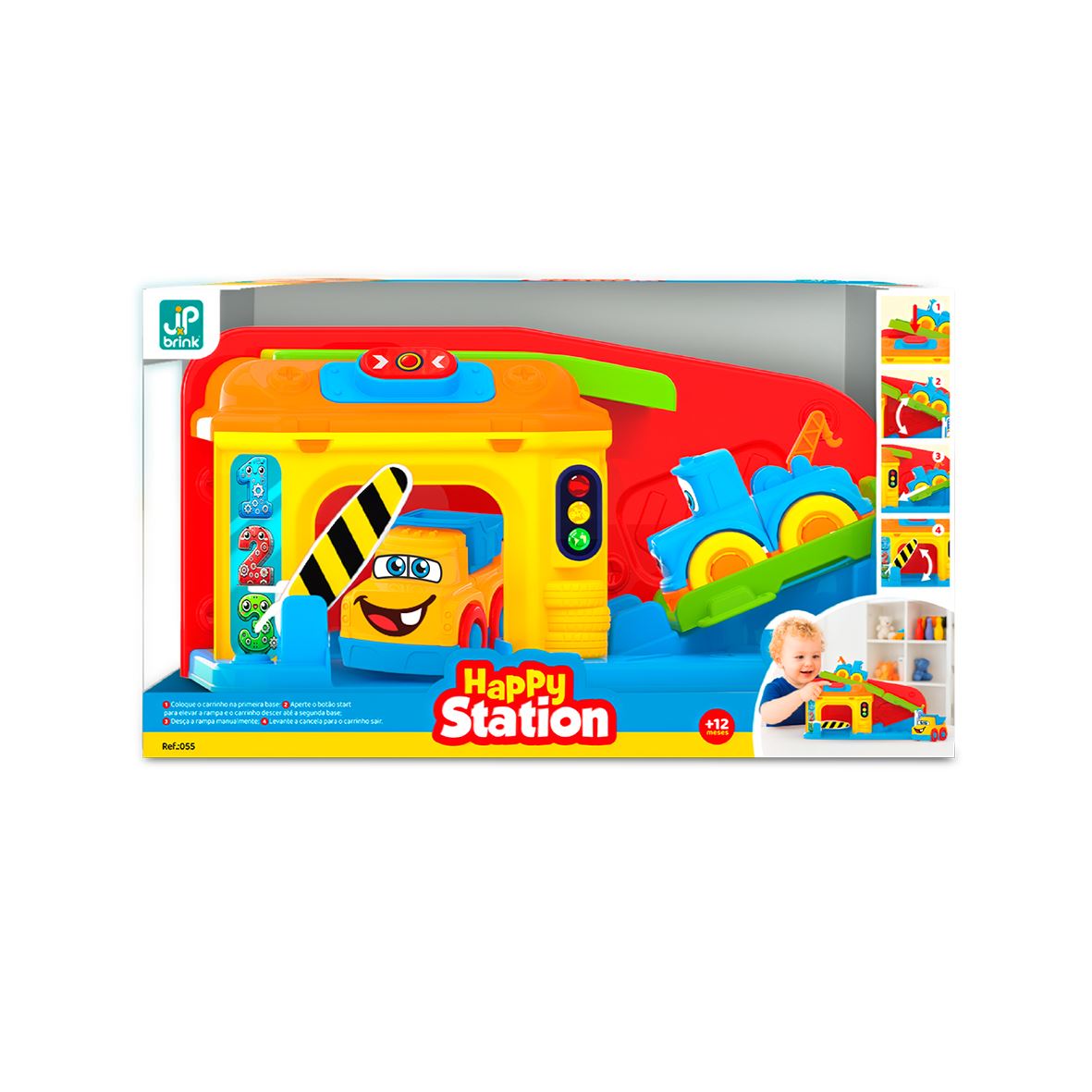 Coloque o carrinho na primeira base, aperte o botão start para elevar a rampa e o carrinho descer até a segunda base. Desça a rampa manualmente e levante a cancela para o carrinho sair. Acompanha 2 carrinhos sorridentes sortidos.