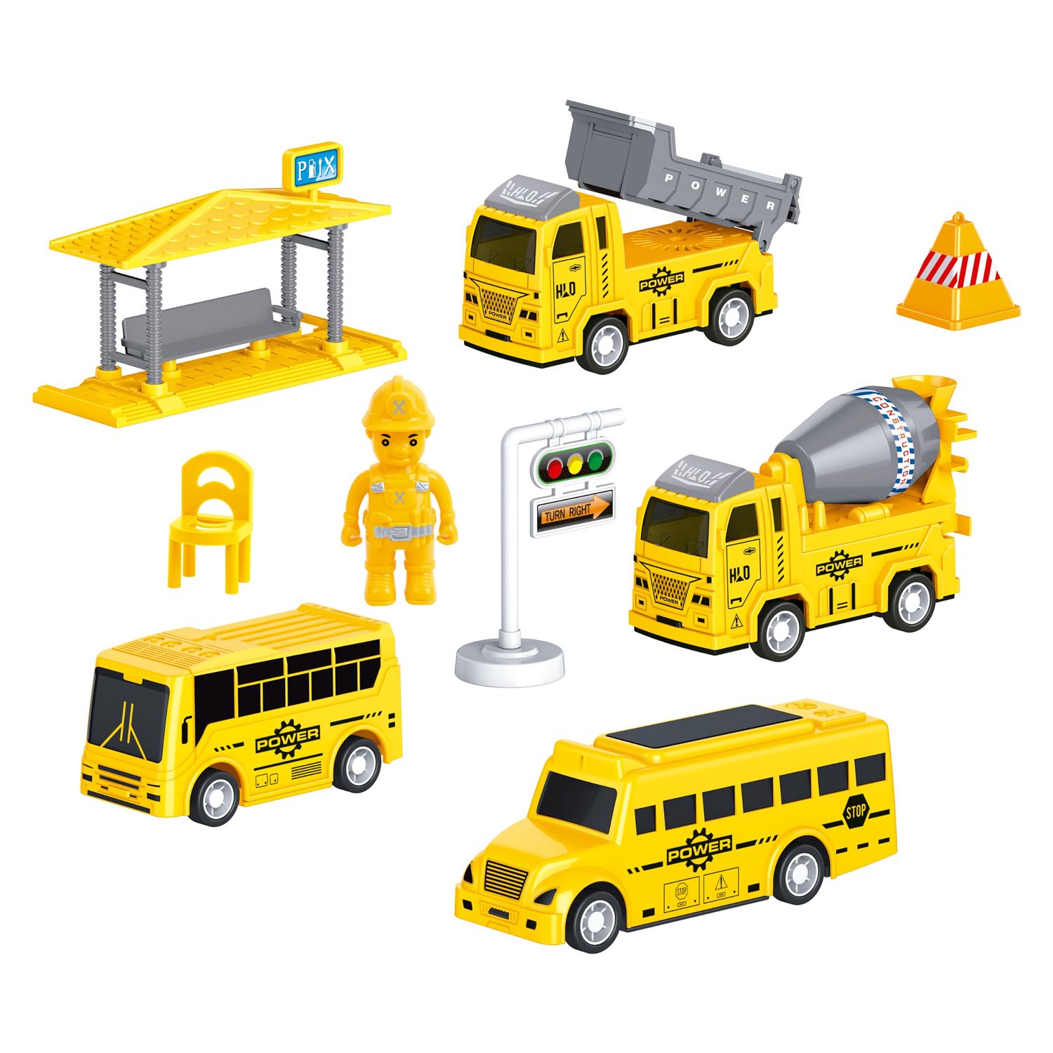 O Kit Carrinhos de Construção é composto por diversos veículos (ônibus, caminhões), bonecos e acessórios para a criança construir um cenário e brincar à vontade.