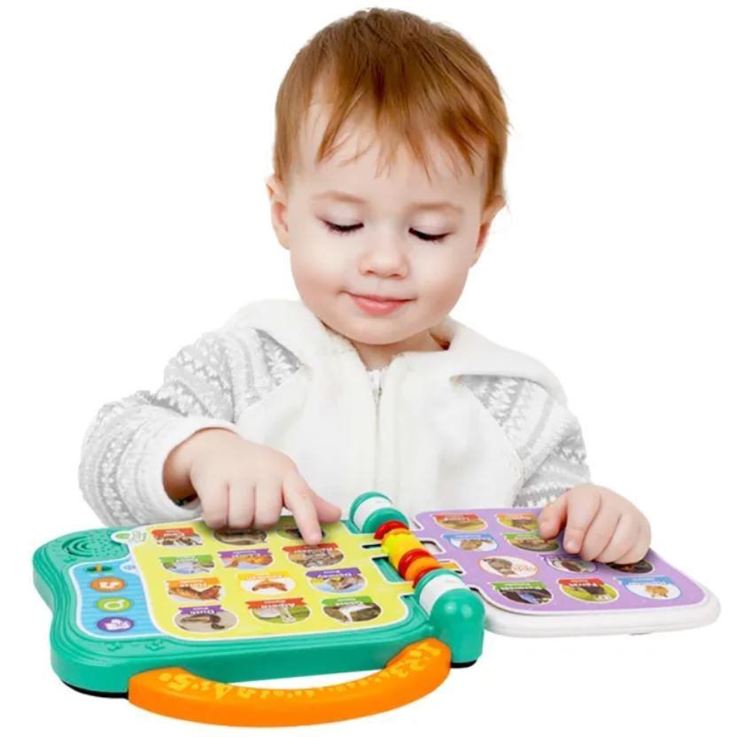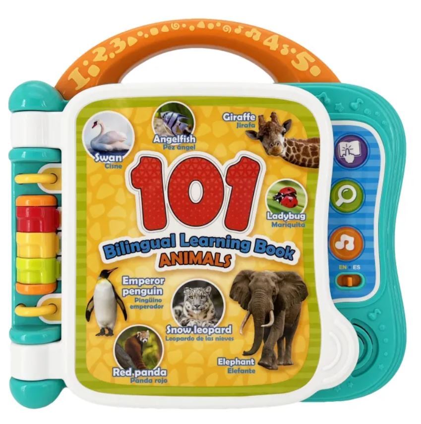 Livro de aprendizado para conhecer animais em duas línguas: inglês e português. Páginas em flip brilhantes e coloridas com sons e melodias. 3 modos de brincar: Aprendizado - aprenda o nome e os sons dos animais, Quiz - encontre o animal correto e Musical - toca sons e melodias divertidas. Possui alça de transporte. Utiliza 2 pilhas AA, 1,5v, alcalinas.