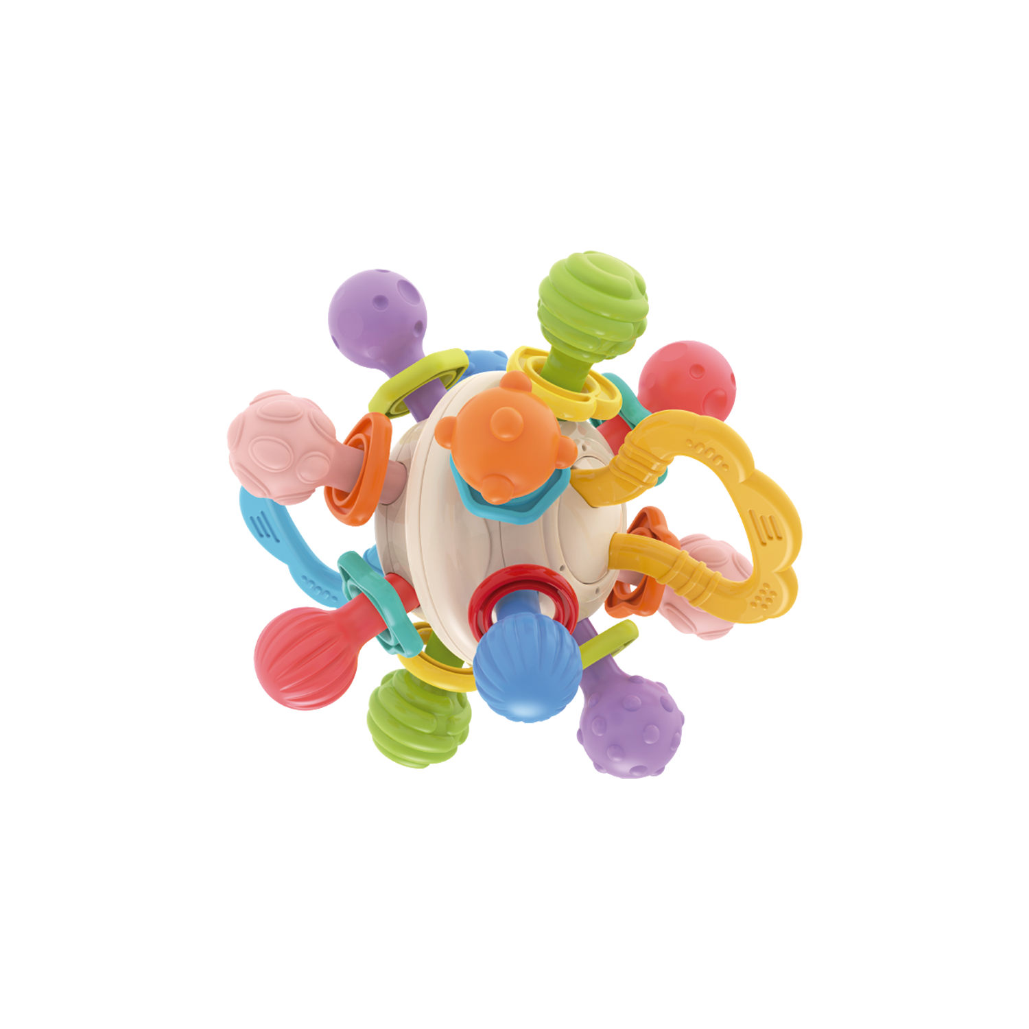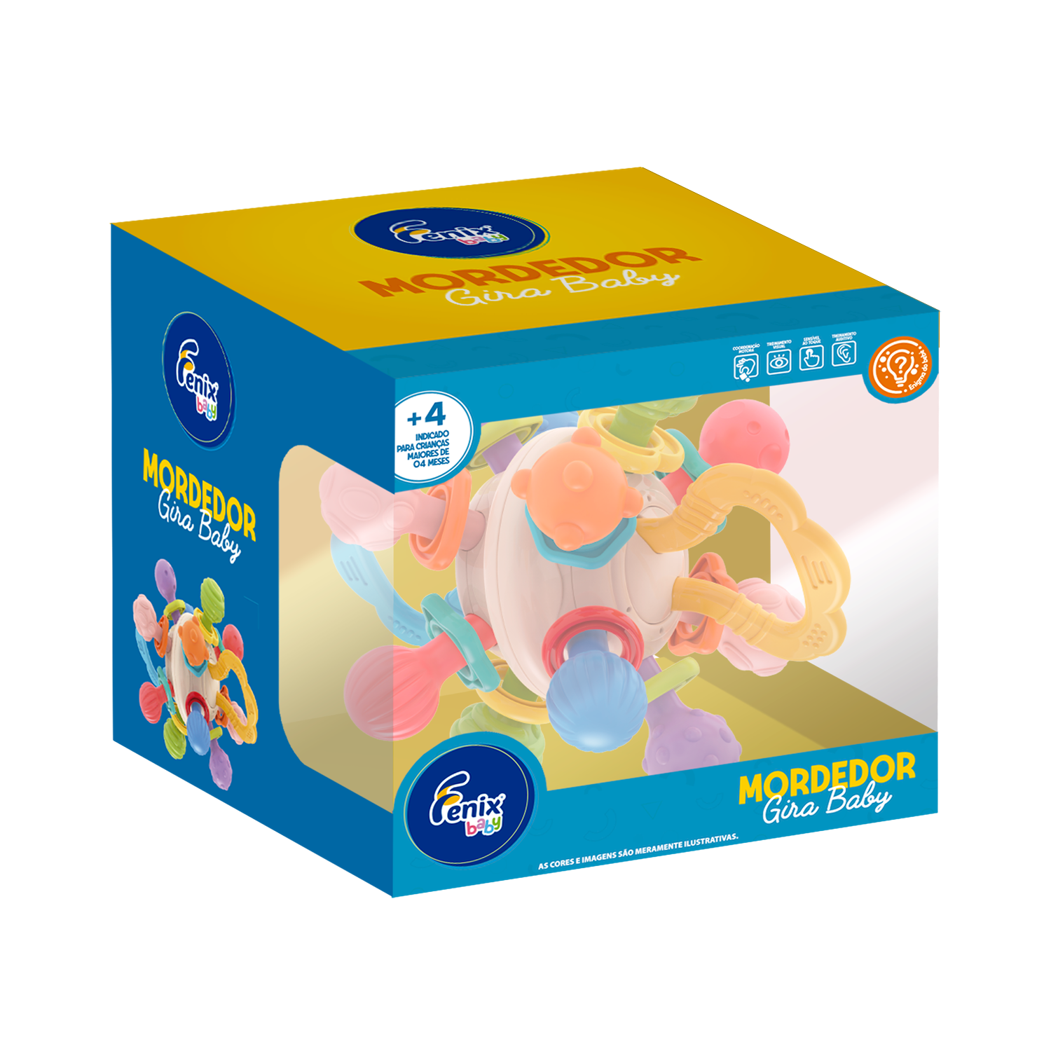 Mordedor giratório com múltiplas texturas, desenvolvido para estimular o tato, despertar a curiosidade e tornar a fase de exploração ainda mais divertida para o bebê.