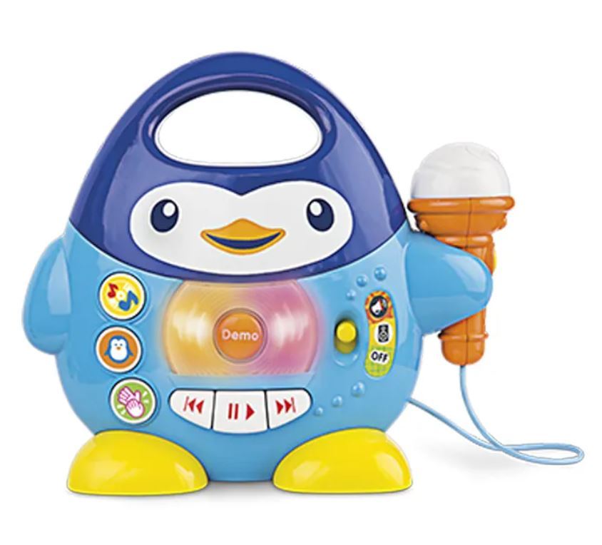 O Pinguim Musical é um reprodutor de música com microfone e efeitos sonoros. Estimula a cognição, a autoexpressão e a coordenação motora. Pinguim reprodutor de música com microfone. Efeito de eco divertido. Luzes intermitentes que acompanham os sons. Melodias e sons de aplausos. Sons de animais para mesclar com as melodias. Utiliza 3 pilhas AA, 1,5v alcalinas.