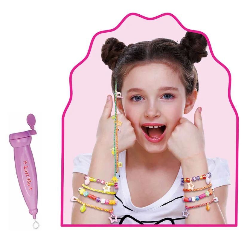 Trançador de fios e kit de miçangas para criar lindas pulseiras e enfeites para cabelo.
