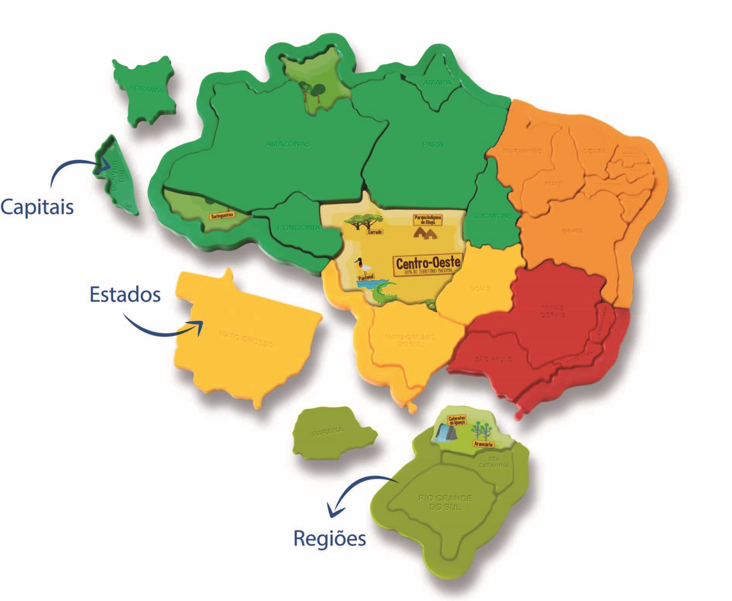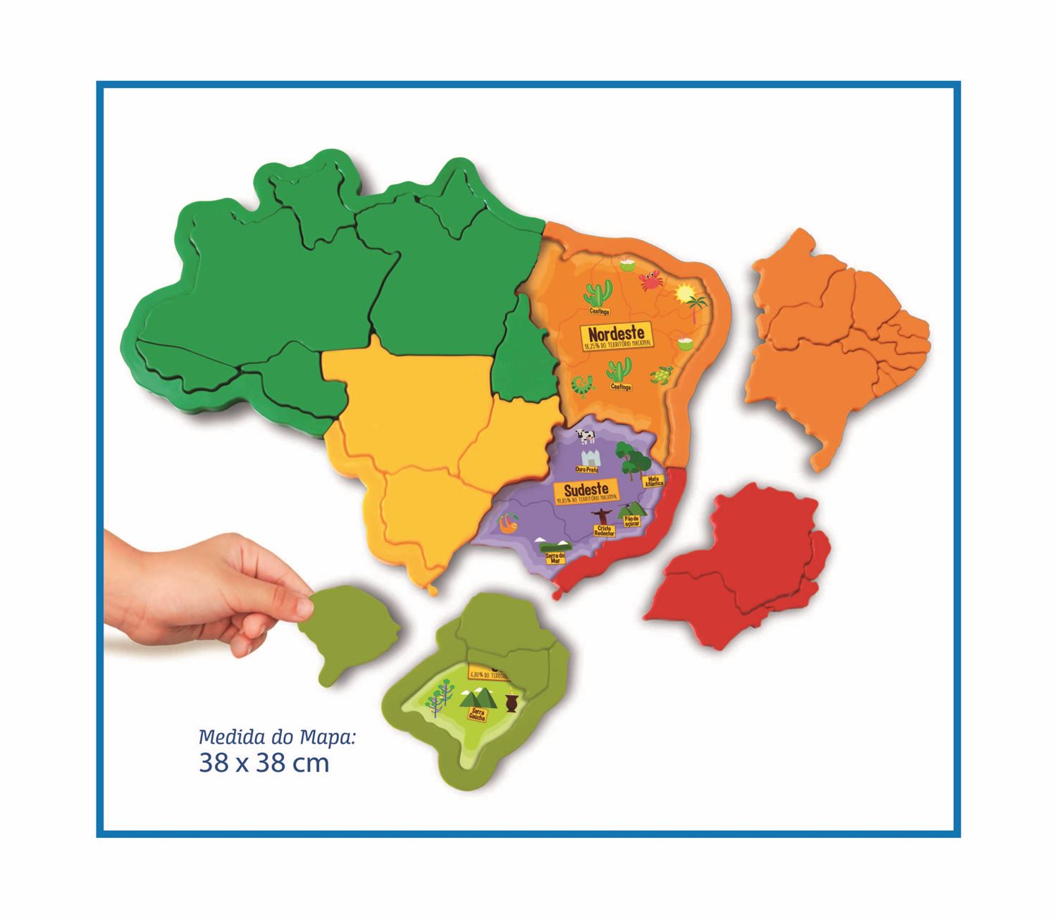 Contém todos os estados do país, subdividido em cores diferentes, alegres e vibrantes, para facilitar o aprendizado e a brincadeira.
