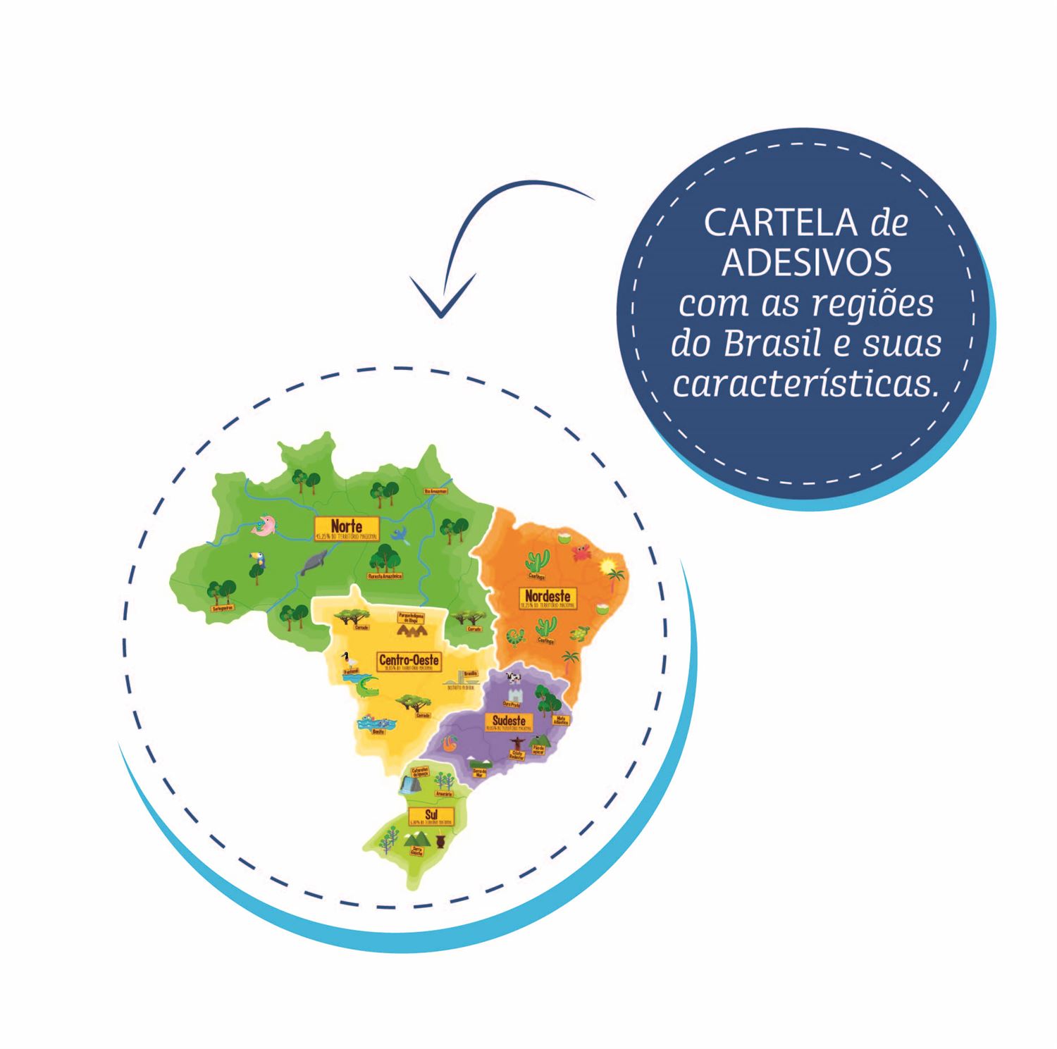 Contém uma cartela de adesivos com as regiões do Brasil e suas características.