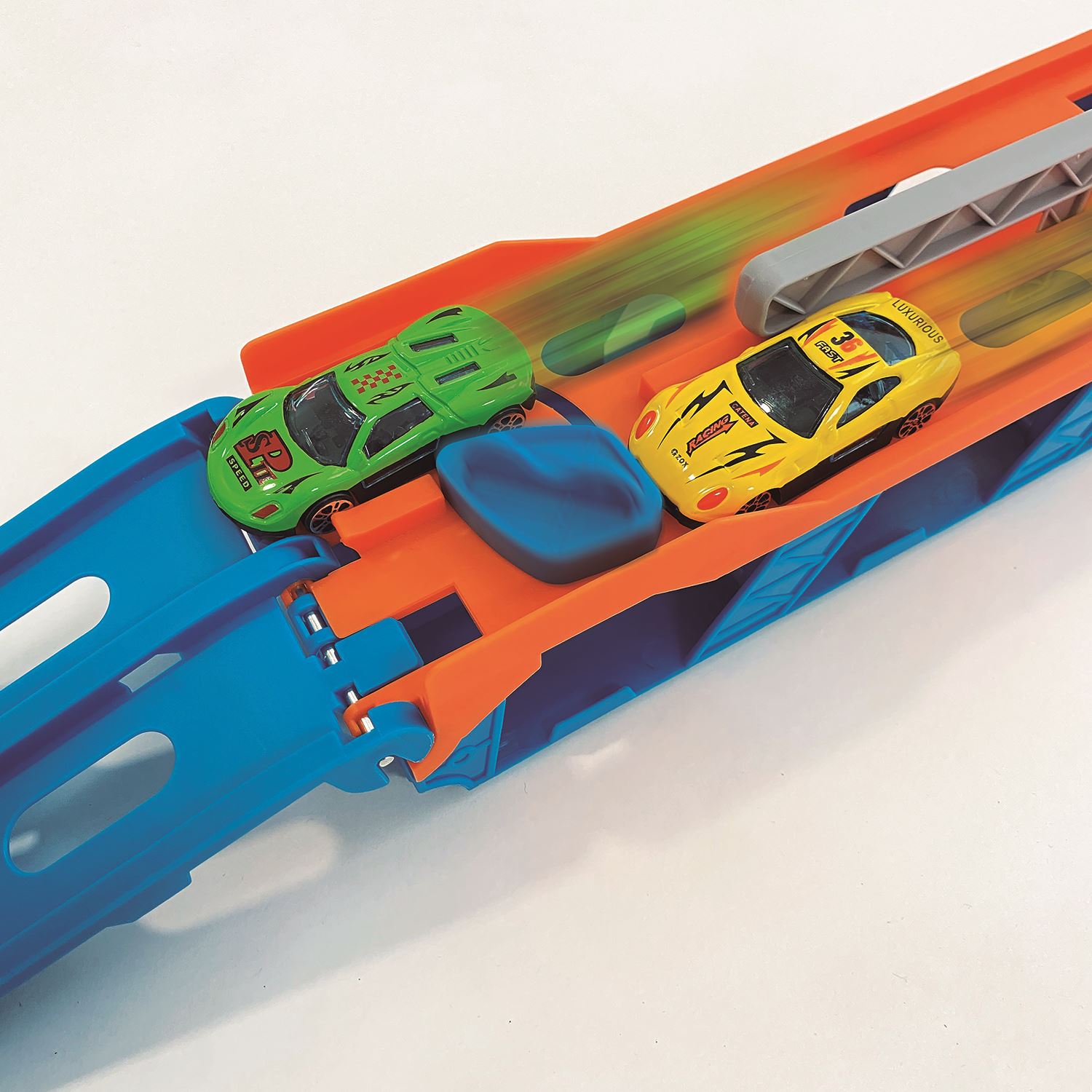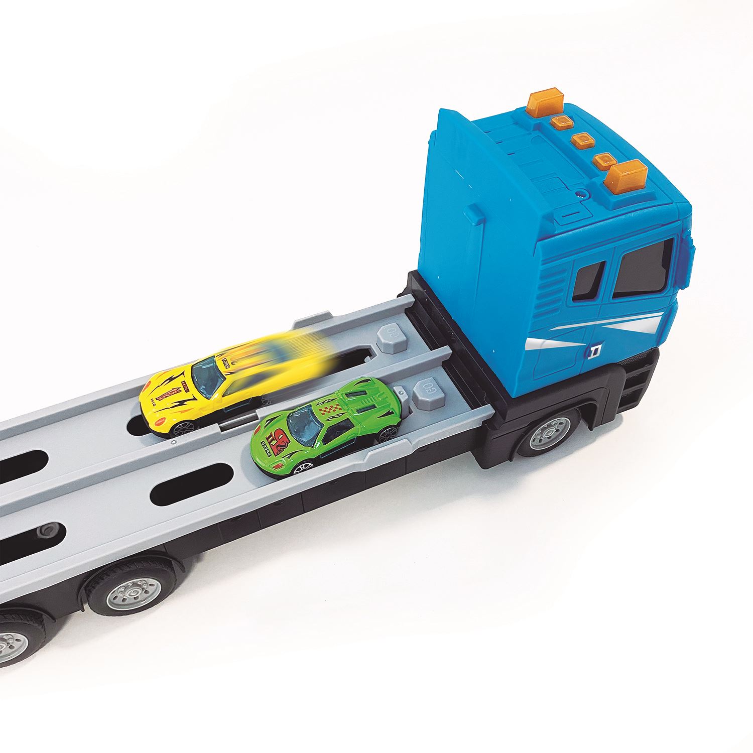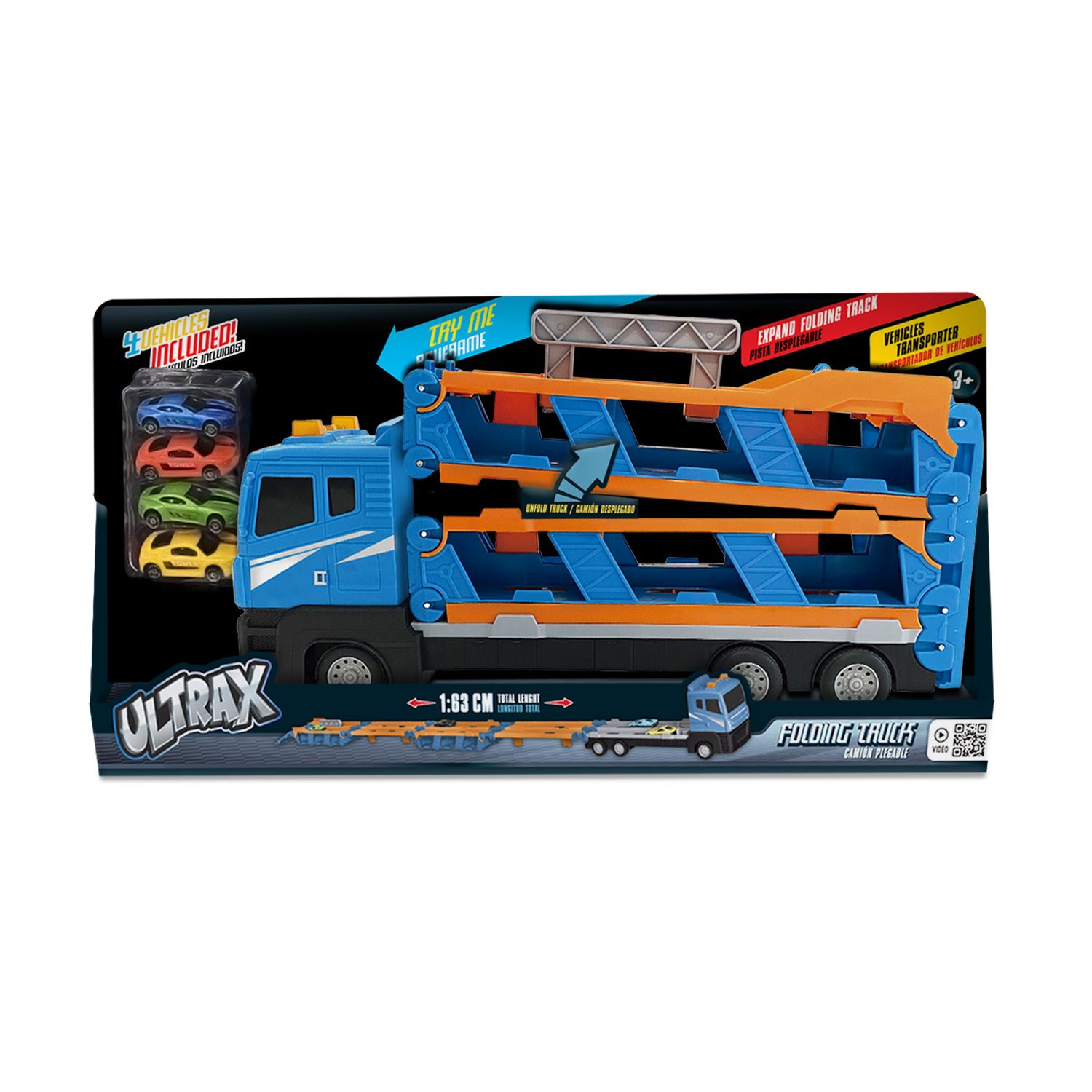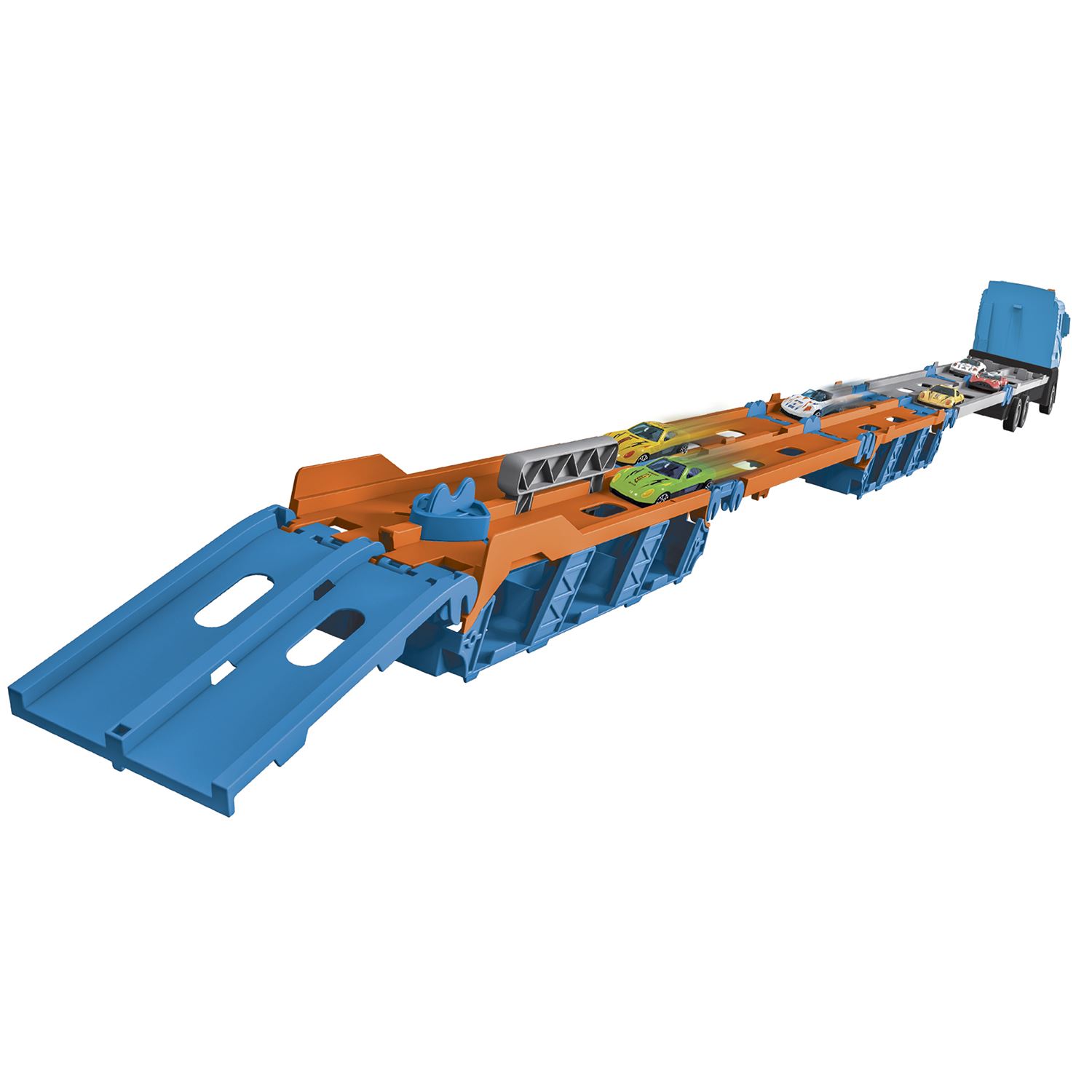 Aventura em grande escala sobre rodas, possui 4 carrinhos inclusos, com pista dobrável e sistema de ejeção para deixar as corridas ainda mais radicais. Caminhão cegonha super completo, luzes e sons para mais realismo.