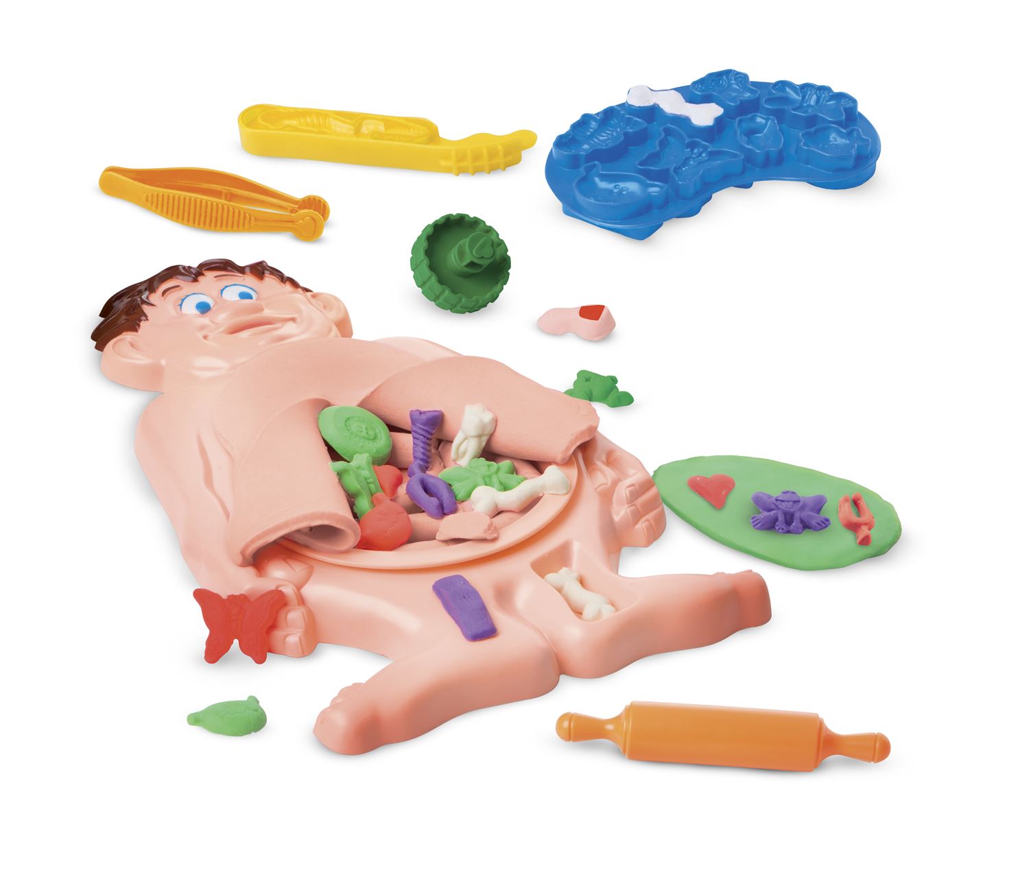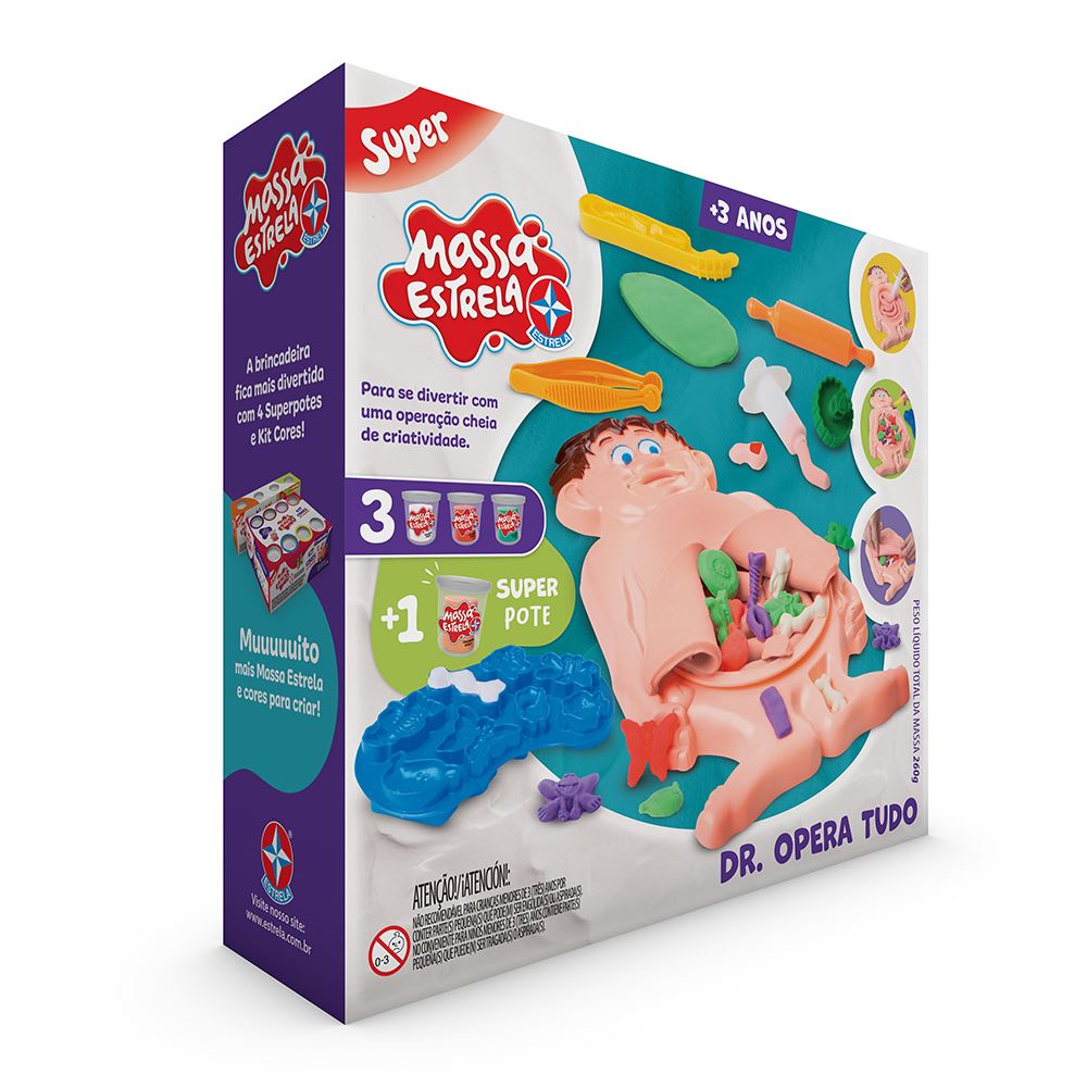 Com Dr. Opera Tudo, a criança pode moldar ossos, borboletas e outros objetos, e colocá-los na barriga do paciente. Após isso, é possível realizar a operação abrindo , fechando e costurando o paciente, quantas vezes quiser. O kit inclui 3 potes de Massa de 50 g, 1 pote de 100 g e acessórios médicos plásticos, como seringa, pinça e bisturi, para uma experiência completa.